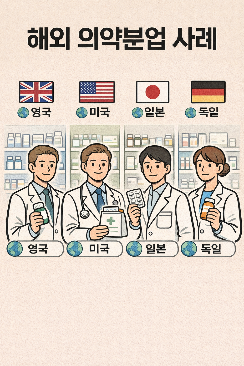 의약분업은 국가별 의료체계와 정책 방향에 따라 다양한 형태로 운영되고 있다. 본 글에서는 미국, 영국, 일본 등 선진국을 중심으로 의약분업 제도의 특징과 약사 역할을 비교 분석하여 해외 의약분업의 공통점과 차별점을 정리한다.
